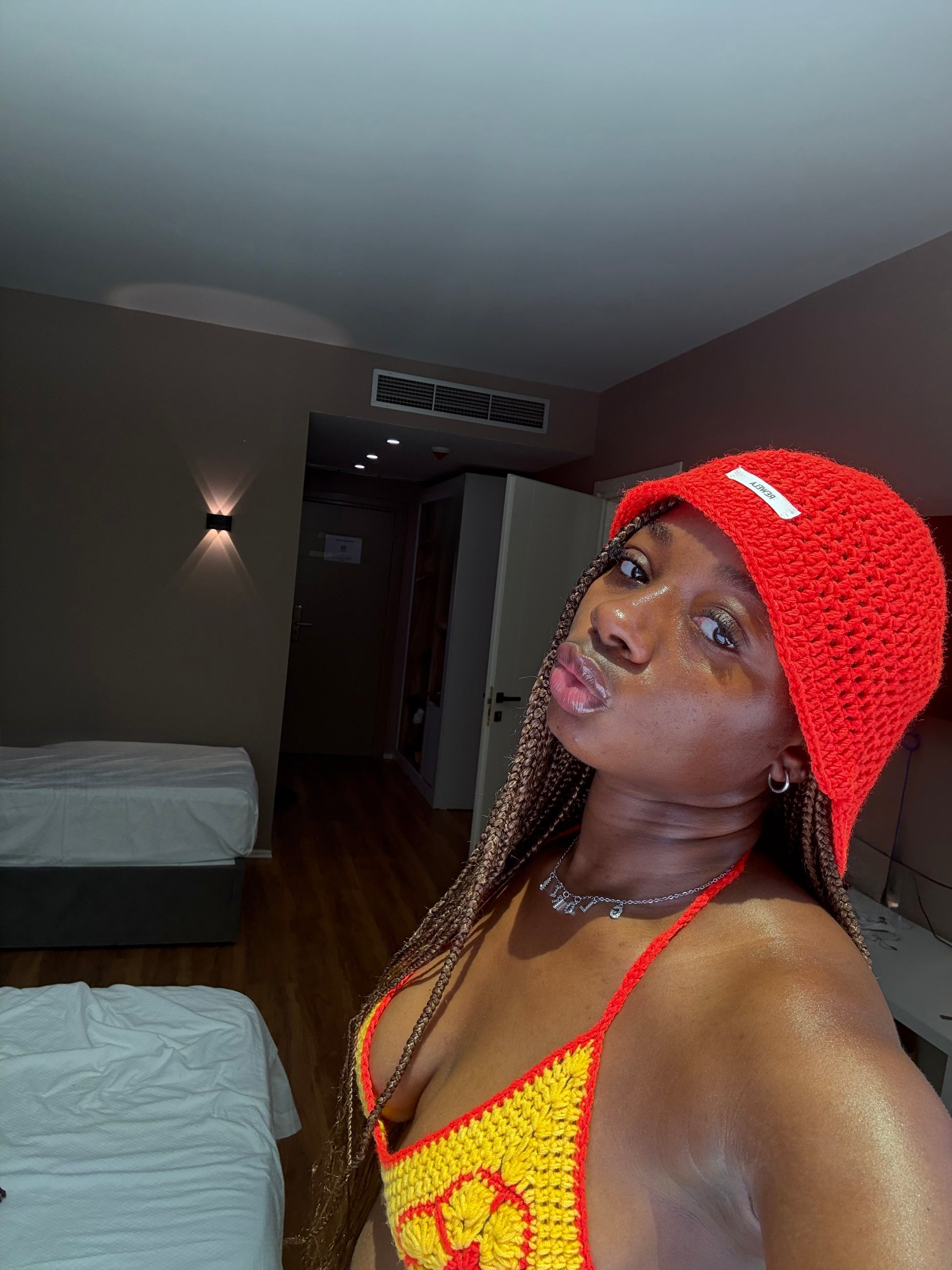Entièrement fait à la main, avec des finitions florales et/Jamaicaines aux couleurs d'été et un point extensible qui épouse parfaitement toutes les silhouettes.